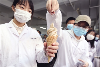 “哇,这个牛奶味好醇香”“口感特别顺滑”“奥利奥口味和巧克力口味的都好吃”……11月18日早上,陕西科技大学食品工艺实验室中传来同学们阵阵讨论声。这节课,他们要做的是冰激凌。从原料调配到杀菌、过滤、均质,再到成品制作,全都由学生亲手完成。
