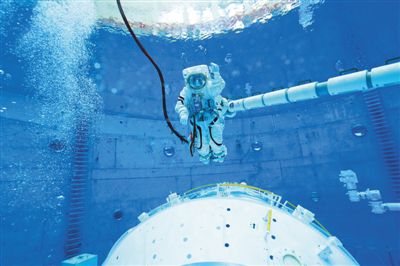 航天员翟志刚身着水下训练服(舱外服之一)进行水下出舱训练 中国航天员科研训练中心供图