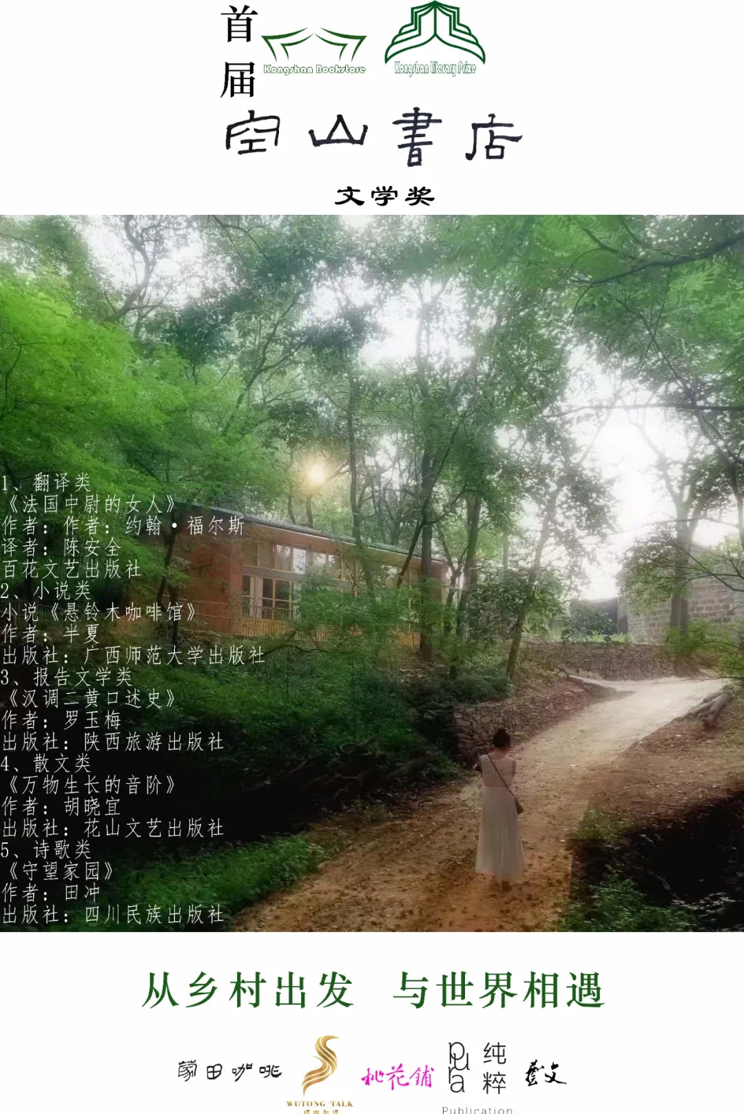 翻译类是由百花文艺出版社出版的陈安全翻译的英国作家约翰·福尔斯的《法国中尉的女人》,小说类是由广西师范大学出版社出版的半夏的《悬铃木咖啡馆》,报告文学类是陕西旅游出版社出版的罗玉梅的《汉调二黄口述史》,散文类是花山文艺出版社出版的胡晓宜的《万物生长的音阶》,诗歌类是四川民族出版社出版的田冲的《守望家园》。