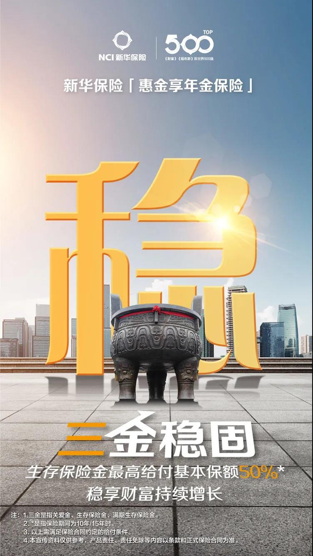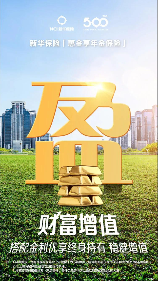 在实现A+H股同步上市10周年之际,新华保险发挥自身专业优势,积极回应客户需求,隆重推出了“惠金享保险产品计划”。“惠金享保险产品计划”由“惠金享年金保险”和“金利优享终身寿险(万能型)”组成。“惠金享年金保险”是一款快速积累、利益确定、最快八年满期的年金保险,搭配“金利优享终身寿险(万能型)”,可帮助客户实现资金的长期积累与财富的终身增值。