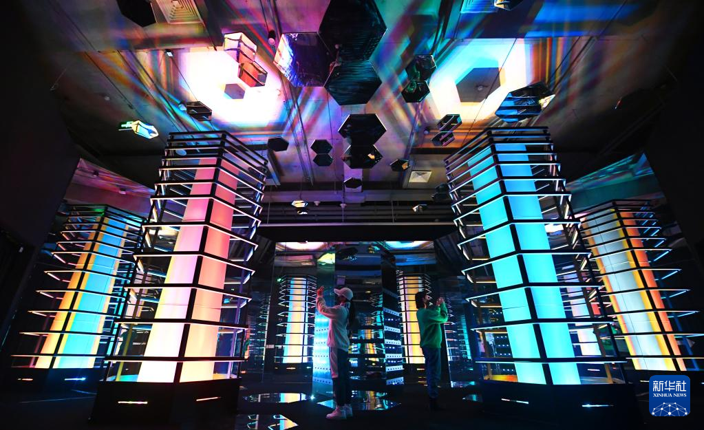 12月14日,在北京时代美术馆,观众参观“向光而行”新媒体艺术展。