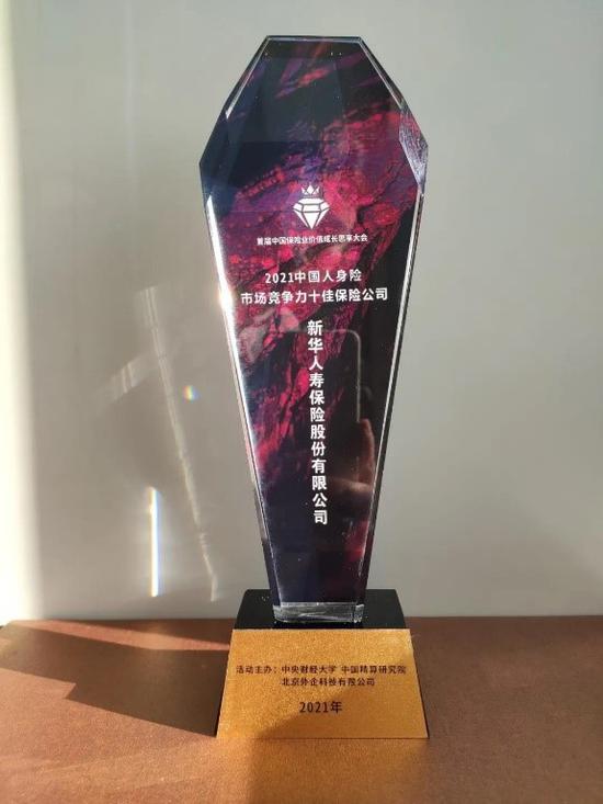 基于公司稳健的经营水平和盈利能力,在由中央财经大学中国精算研究院、北京外企科技有限公司、数字产业创新研究中心共同主办,人民日报健康客户端健康保险频道媒体支持的2021首届中国保险业价值成长思享会暨保险业数字化峰会上,新华保险荣获“2021中国人身险市场竞争力十佳保险公司”;在证券之星主办的2021财经风云榜评选中,新华保险获得“年度卓越保险品牌奖”。