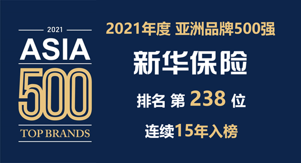 9月,世界品牌实验室(World Brand Lab)发布2021年《亚洲品牌500强》排行榜,新华保险排名第238位,连续十五年入围榜单。