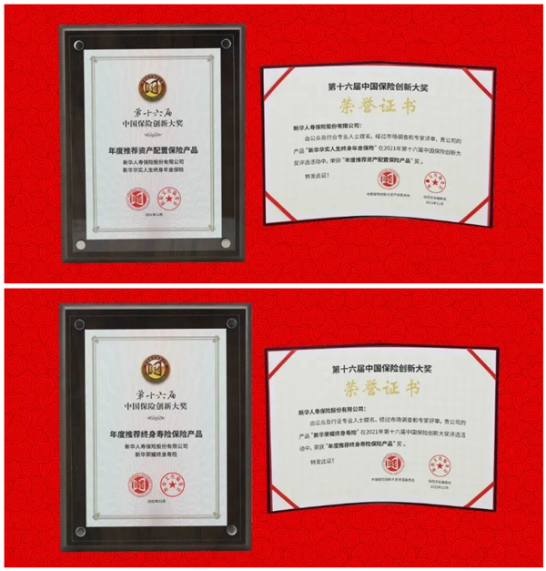 12月,在《保险文化》杂志社主办的第十六届中国保险创新大奖评选中,新华保险华实人生终身年金保险获得“年度推荐资产配置保险产品”,荣耀终身寿险获得“年度推荐终身寿险保险产品”。