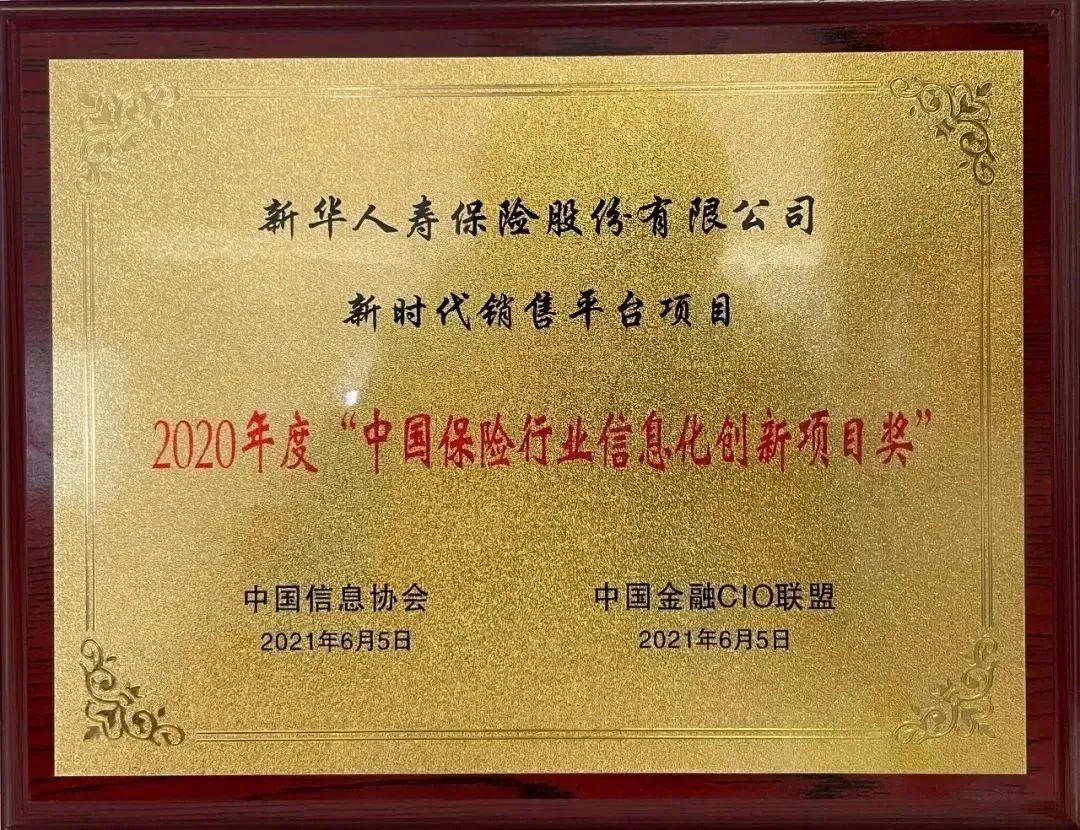 2020年度保险信息化技术峰会上,新华保险新时代销售平台APP在中国金融CIO联盟组织的年度优秀成果评选中荣获“2020年度中国保险行业信息化创新项目奖”。