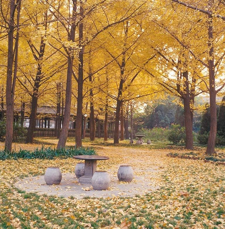 同一棵银杏树上的叶子基本同步变色,着同一个色号。如此对个性的克制,倒成全了一种匀称的整体美,达到了“纯净即是艳丽”的境界。但不同的银杏林、或即便同一片林里,树跟树的节奏差异有时却很大:这儿的都落幕了,那儿的还在台上。一次路过大雁塔北广场,就遇到两棵银杏树,一棵一叶不剩,一棵满身披挂。正因为如此,如果你在这儿没赶上看黄叶,可以到另一个地方去看。
