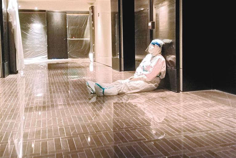 图中的这位“大白”,实在是太累了,坐在酒店的走廊上就睡着了。她是西安国际医学中心整形医院皮肤科医生赵玢,目前正在高新区一家隔离酒店,执行为隔离人员核酸检测任务。