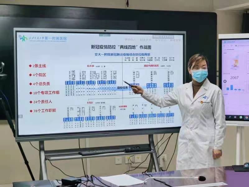 西安本土疫情发展以来,西安交大一附院一手抓疫情防控,一手抓医疗服务,在医院本部、支援的新冠肺炎定点医院西安市胸科医院、东院区(阎良)、兴善寺院区(康复院区)同时进行双线运作。面对严峻复杂的疫情形势和人力资源严重短缺的重重困难,交大一附院党委果断决策,“挂图抗疫”,实现了“两线四院”体系化、科学化、精准化指挥的目标。