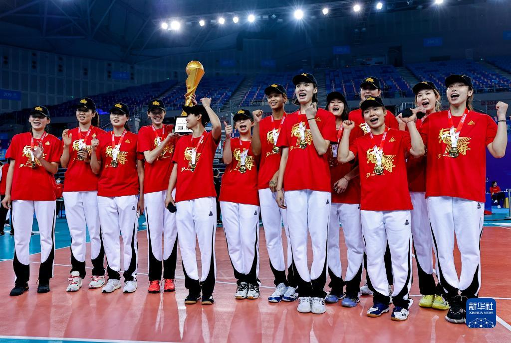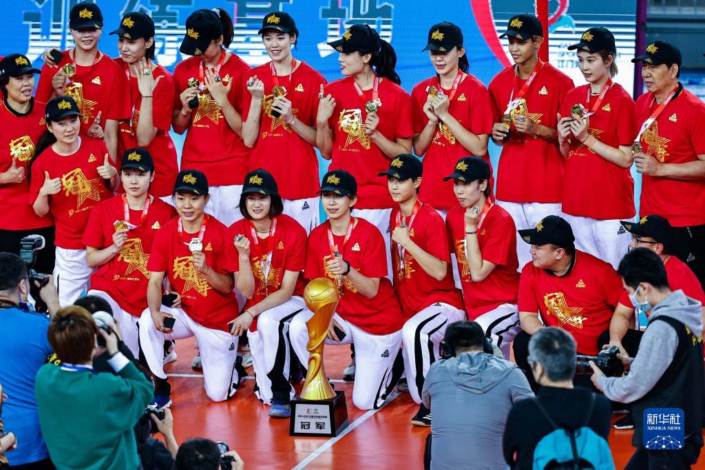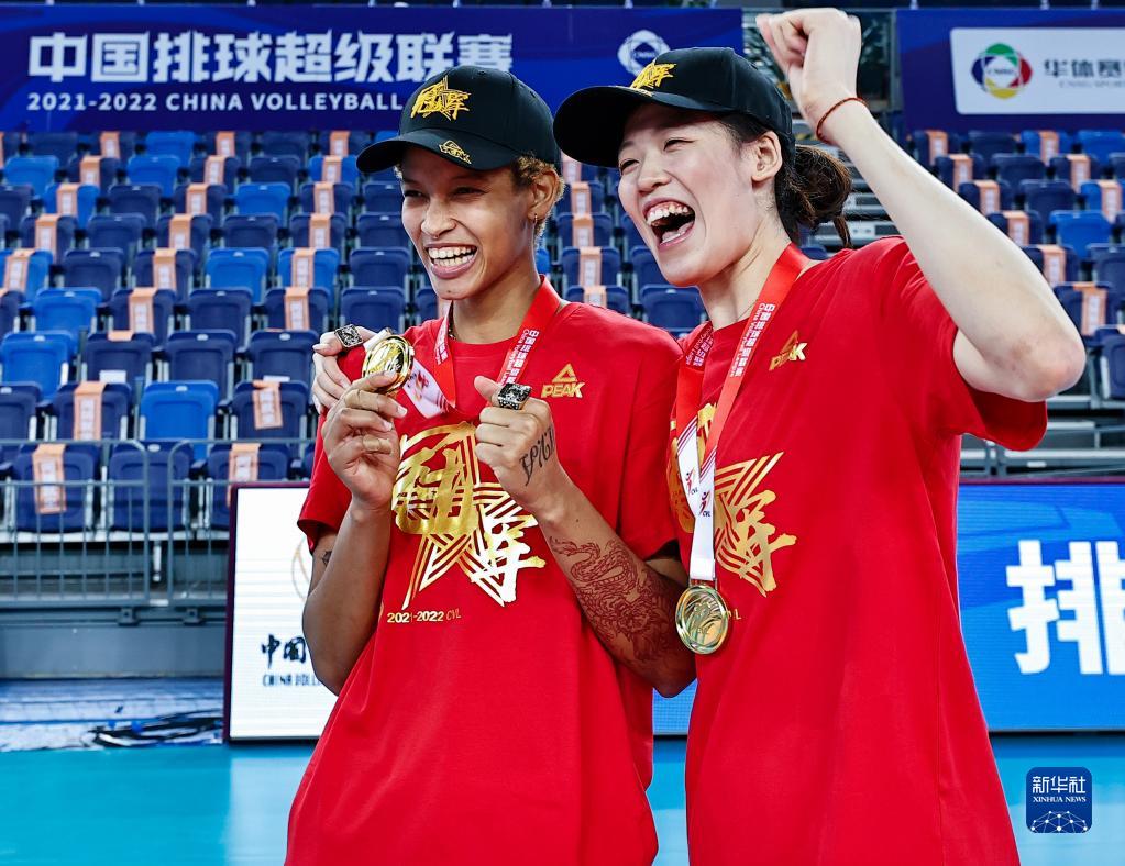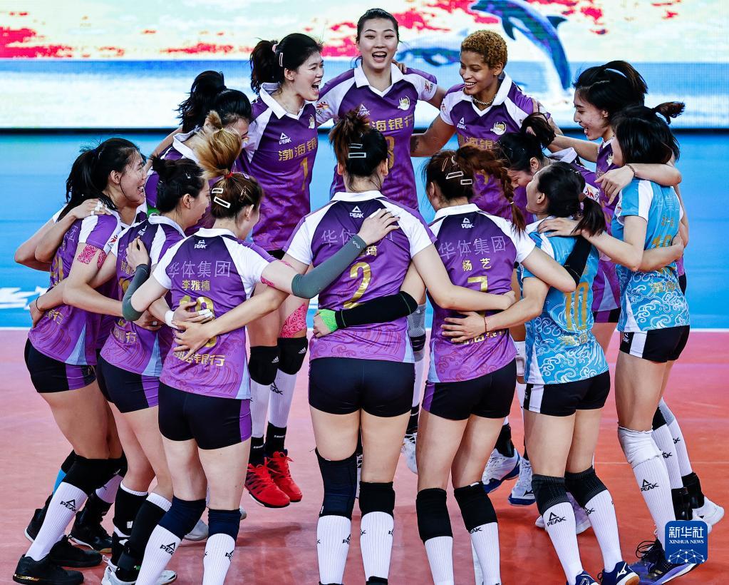 当日,在广东江门举行的2021-2022赛季中国女子排球超级联赛冠军争夺战第二场较量中,天津渤海银行队以3比0战胜江苏中天钢铁队,从而以2比0的总比分夺得冠军。