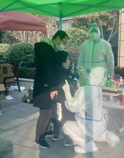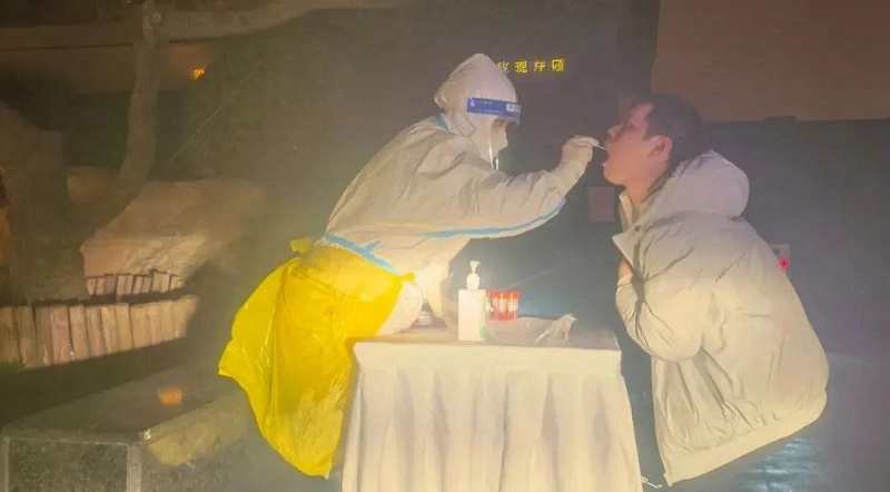 寒冷的深夜,李锦依然在核酸采样台前紧张忙碌着