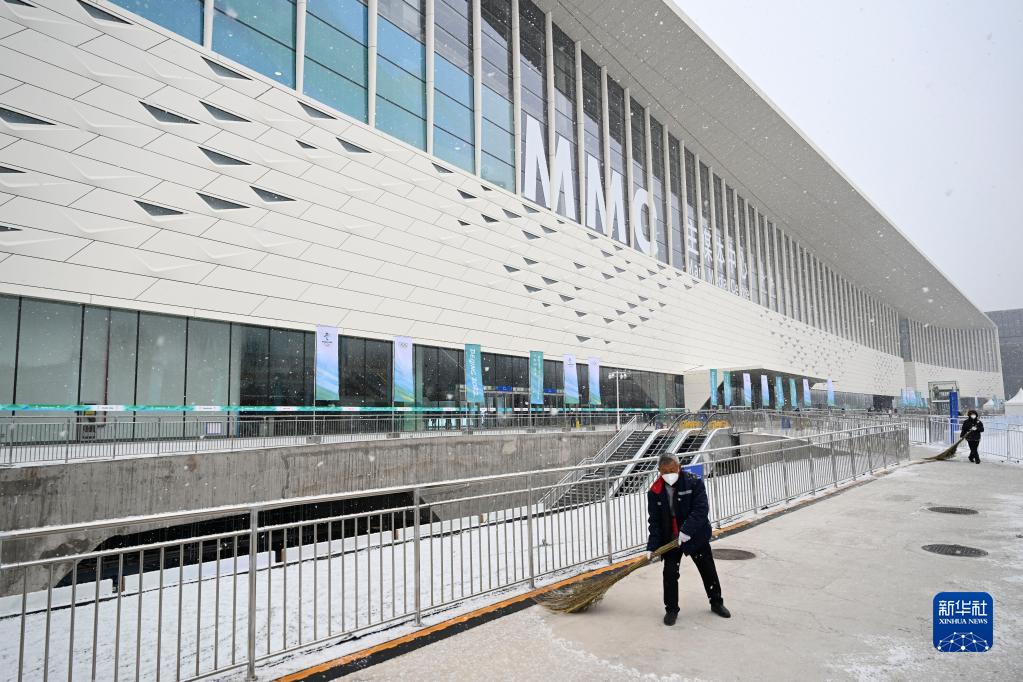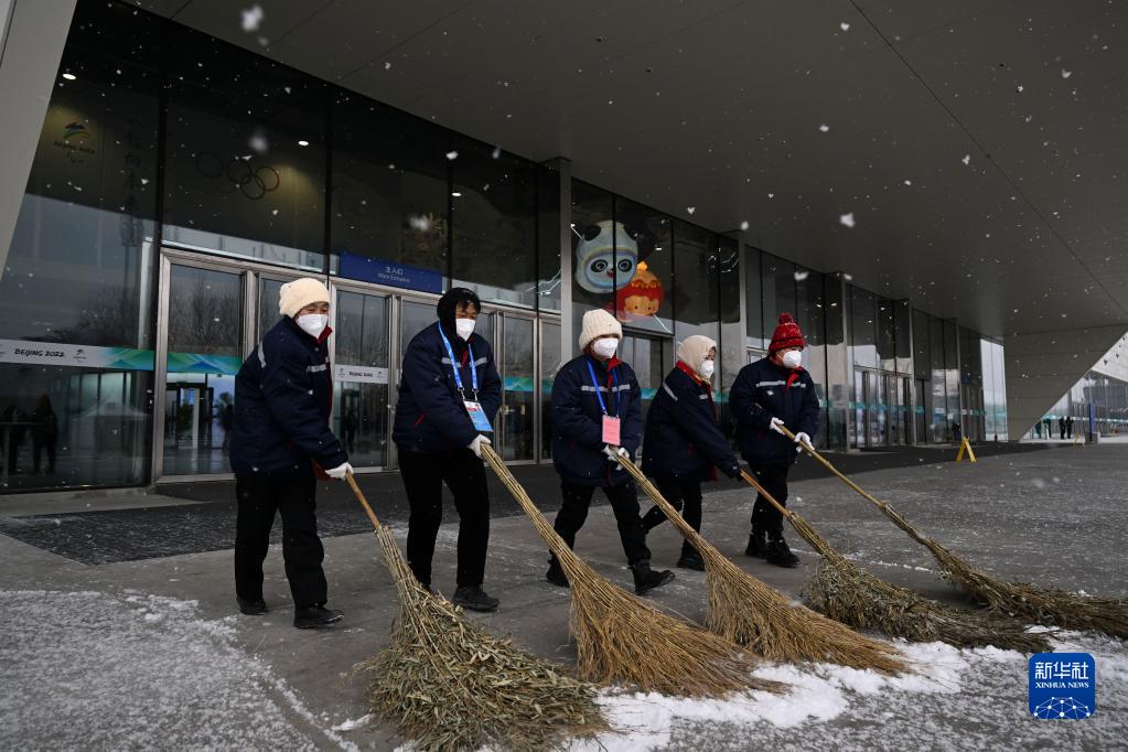 1月20日,工作人员在北京冬奥会主媒体中心外扫雪。