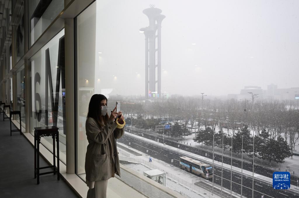 1月20日,一名女士在北京冬奥会主媒体中心拍摄窗外的雪景。