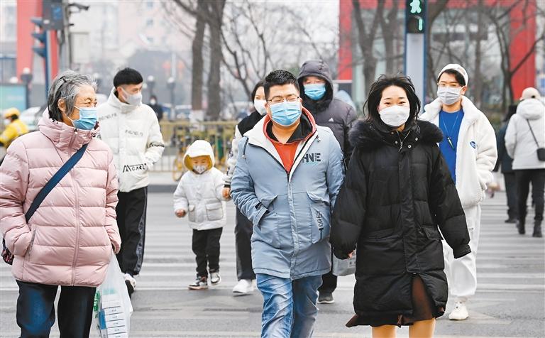 1月20日,市民行走在未央区未央路斑马线上。(记者 陶明 摄)