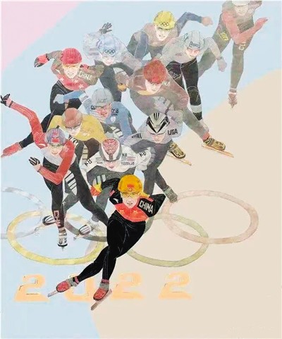 以冬奥为题材的作品是本届北京双年展的最大看点。李宏钧的中国画《生命之光》以巨幅壁画般恢宏的超时空构图和工笔重彩的精致描绘,表现了各个冰雪赛场和各项冰雪运动的生动景象;北京冬奥会会徽位于中央位置,如暖阳普照般把奥运精神传递至全世界。《生命之光·中国速度》《巅峰舞雪》《跨越》等作品定格了冰雪竞技激动人心的瞬间;《冬奥会国家滑雪跳台——雪如意》《筑梦奥运》描绘了冬奥竞赛场馆的建设场景;《能所不能》《夺金时刻之武大靖》是对奥运健儿的精妙刻画;《舞台系列No.16——第2022乐章》《绽放的冬奥之花》则以视觉语言多元诠释奥林匹克精神。