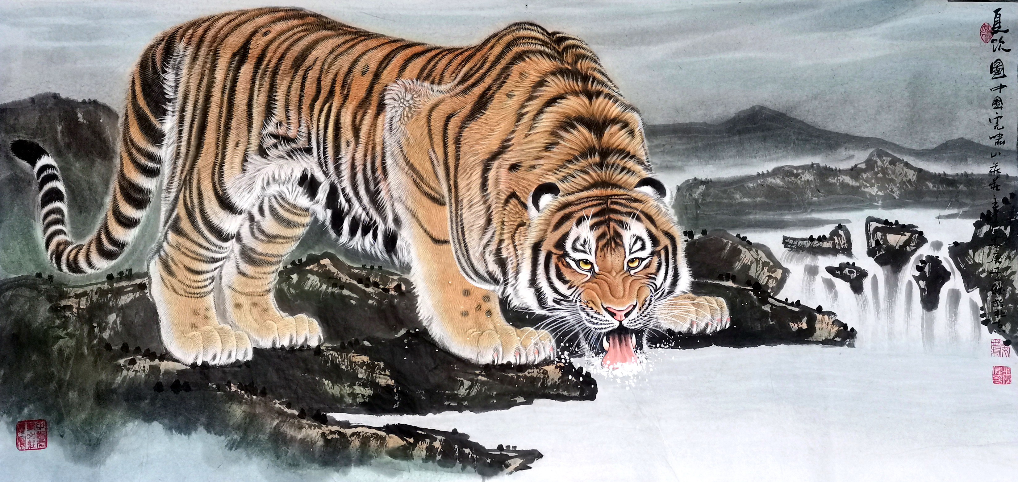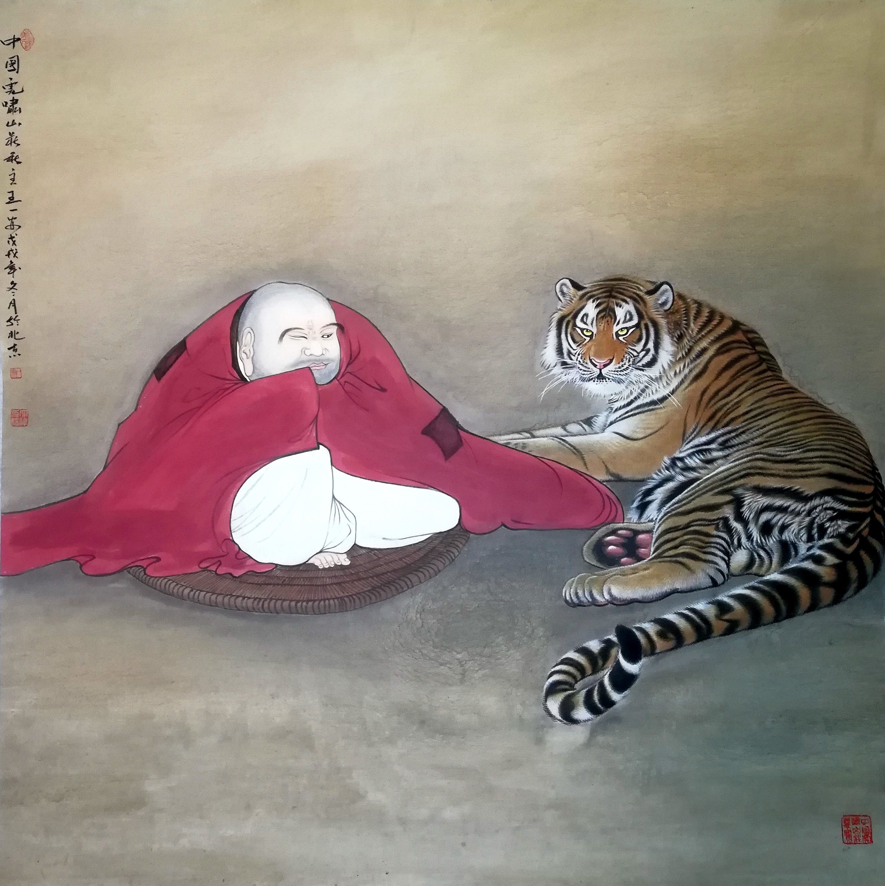 王一安读黑格尔《美学》,研《庄子》,他“精心调墨饲大虫”的另一种形式是挥毫写意,写心中之意,散胸中之逸气,绘心中之虎,立意多来自文史资料和佛学典故,画面追求空灵,透着禅意。写意画须“成画在胸”“意在笔先”,要以简练、概括的笔墨描绘物象,讲究神似取其意态,心中之念纵笔一挥跃然纸上,是作者感情的抒发。青藤道人就有“不求形似求生韵”的诗句,齐白石先生也有:“作画妙在似与不似之间,太似为媚俗,不似为欺世”的名句。王一安对这些经典论述心领神会,深谙其道,他的写意虎就不渲染虎的谨慎和凶残,而是着重表现“山大王”拟人化了的内在威严,无论是上山虎,还是下山虎;也无论是坐卧之虎,还是奔跑之虎;更无论是依偎戏闹之虎,还是成群之虎,都被他精心调墨逸笔草草不求形似地聊表胸中意气了。在这块写意的自留地里他擅长讲“老虎修禅得正果”的故事,作品有《丰干骑虎》《达摩伏虎》《罗汉饲虎》《神女伏虎》等等,作品《抚琴度虎图》纵向构图,画面简素,一虎、一琴、一僧偏置于下方,近一半的上部空白凸显深邃,老僧着木兰色长褂,取侧背之姿面虎而席地抚琴,被度之虎祥顺安静地卧于僧前,舒卷自在的虎尾微微上翘,一幅超然大仙模样。画的左上角题句:“仰窥低审含情客,似听无弦一弄中”取自宋徽宗赵佶《听琴图》,落长款:中国虎啸山庄王一安庚子春月於古长安。钤朱文“一安”印、白文“大伟印信”。右下角压朱文“中国虎啸山庄鉴赏”章。整个画面给人一种似乎有琴声传出的感觉,仿佛又有片片祥云从被度之虎身后飘过。