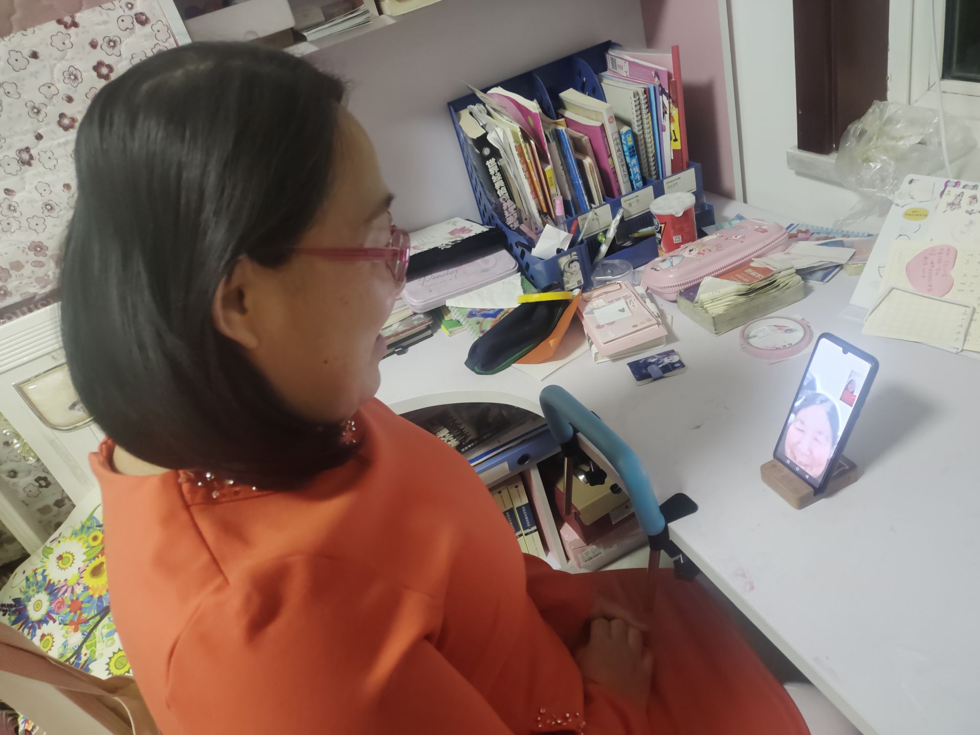 李树芳正在给家人“云”拜年