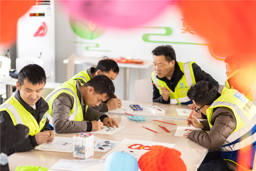 活动现场,工友们在绘制北京冬奥会吉祥物
