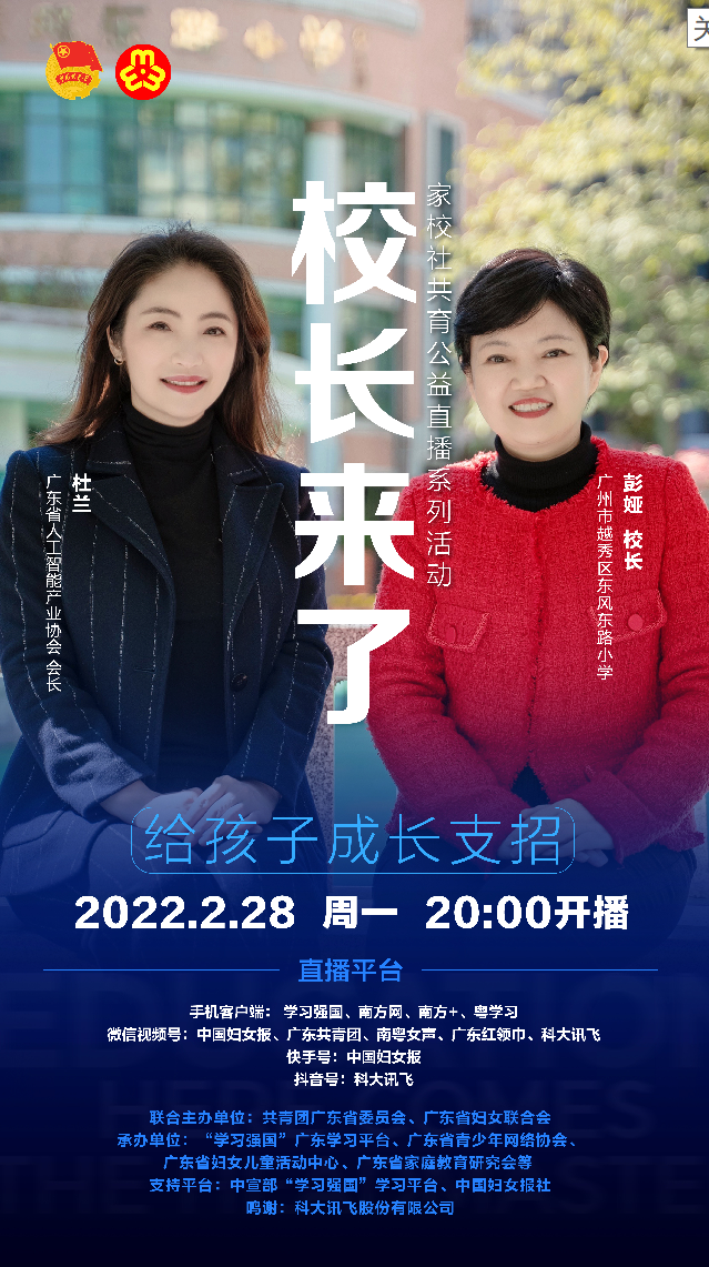 2022年2月28日晚8点,“家校社共育公益直播系列活动”第三期“校长来了——给孩子成长支招”开播,广州市越秀区东风东路小学校长彭娅线上畅谈“灵动教育”,为“双减”之下的“家校社共育”支招。届时,您进入“学习强国”APP推荐频道或实播中国频道即可观看直播。