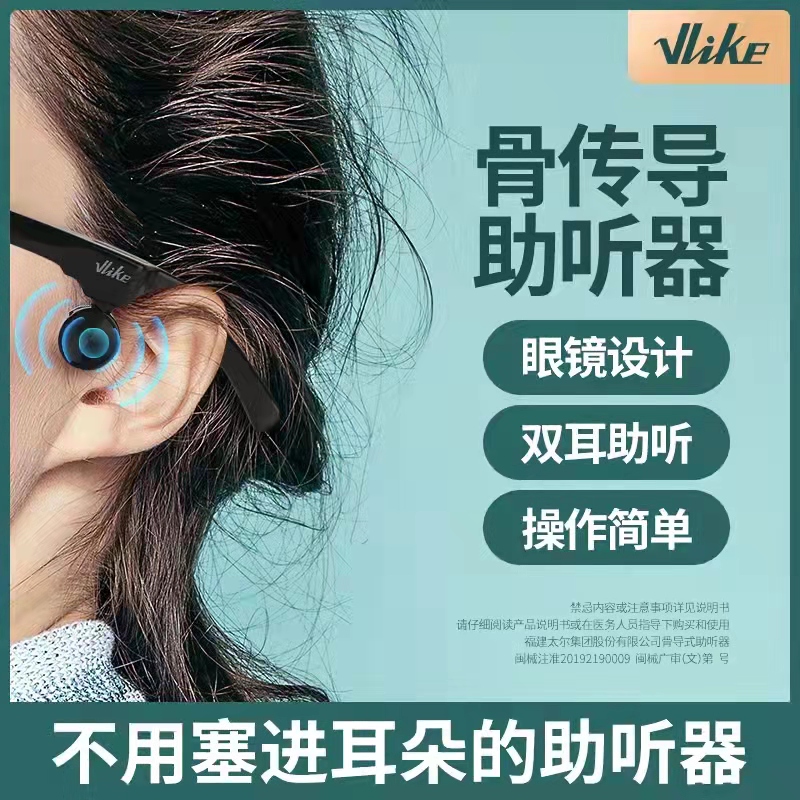 Vlike骨传导助听器是一款不用塞进耳朵的助听器,运用骨传导技术,通过骨阵子将声音变成振动信号由头骨直接传递到内耳听觉神经。提供非入耳式的佩戴体验。产品形态有眼镜式和后挂式。新品有充电蓝牙款。产品适用于传导性耳聋,中耳炎患者,耳道闭锁混合型耳聋及感音神经性耳聋患者。