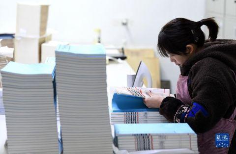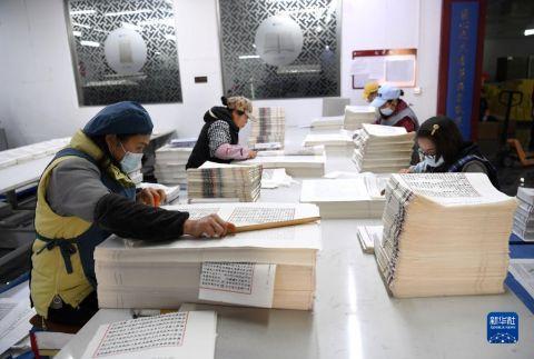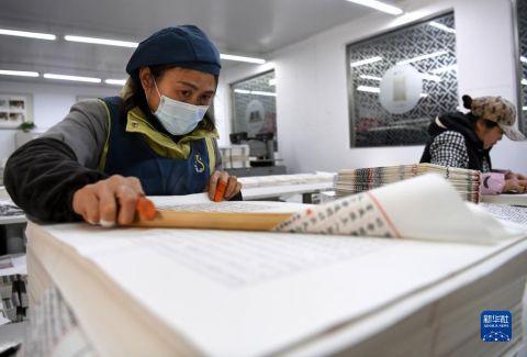 3月3日,工人在泾县丁家桥镇一家宣纸企业内制作宣纸线装书。