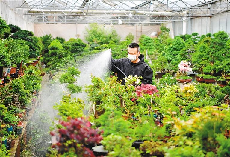 3月16日,在长安区黄良街道堀垛村一家花卉市场内,工作人员在为盆景浇水。