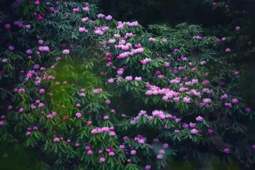 一路向上,海拔2300-3000米的区域,秦岭冷杉和灌木丛交相辉映,孤傲冷杉与灿烂花海相互依托,秦岭腹地的气象万千在此汇聚,带来的是难以名状的令人动容。站在这里,一览众花峰,欣赏紫红色、淡紫色与深紫色浅浅淡淡的交叠,寻觅到绯色云霞的可爱,又沉醉于花开胜火的热情,步入花丛,仿佛进入童话领地。