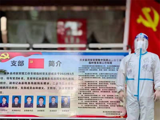 没有时间胡思乱想,忙乱纷杂的工作将他淹没。西乡县税务局作为隔离点牵头责任单位,会同医疗、公安部门承担着登记入住、核酸检测、医疗垃圾打包转运、环境整治、场所消杀、录入疫情台账等隔离防控大小事务。此外,考虑到隔离人员都是外地人,临时党支部除加强隔离期间的心理疏导外,还结合饮食习惯,统筹安排餐食。隔离点有部分老人和小孩,认真负责的同时,工作更需多一份热情和耐心。作为青年税务干部,他是支部的排头兵,炎热的天气、高强度的劳作,防护服里的汗水凝结成蒸汽让他眼前一片朦胧,但护目镜外党旗的那一抹鲜红在他眼里格外醒目,作为一名税务党建工作者,平常专注于理论知识学习,今天,他对党有了更加切身的认识。