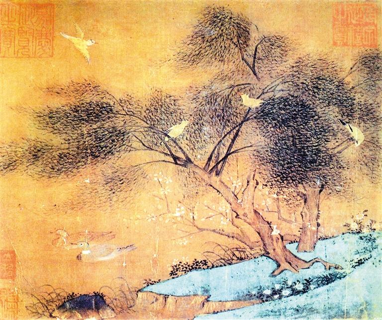 《芳溆春禽》册页,绢本,设色,纵22.3厘米、横25.6厘米。此图描绘的是皇家园林湖面一角,水边蒹葭苍苍,水草萋萋;岸上绿草如茵,草花盛开,散布其间;两株柳树一斜一直,婀娜多姿,在和煦春风的吹拂下,枝叶婆娑,犹如贺知章的诗句:“碧玉妆成一树高,万条垂下绿丝绦。不知细叶谁裁出,二月春风似剪刀。”几株桃树在柳树下斜伸水面,盛开着一朵朵或粉或红的花朵,如南宋词人韩元吉所写:“东风著意,先上小桃枝。红粉腻,娇如醉。倚朱扉。”在柳树的上空,一只黄鹂展翅飞翔;一株柳树上栖着两只黄鹂,相对而鸣,其中的一只仰望空中,与盘桓空中的那只互相嘤鸣应和,似招呼它前来入伙。另一株柳树上的那只黄鹂,却不被这边的热闹景象所吸引,专心致志俯视着树下草丛,好像发现了藏在草中的昆虫,准备俯冲而下捕捉,好好地美餐一顿。四只黄鹂情态各异,气韵生动,活泼可爱,为静谧的景色增添了热闹的气氛。这种场景似杜甫描述的“两个黄鹂鸣翠柳”,又似晏殊吟诵的“叶底黄鹂一两声”,又像杨万里描写的“春禽处处讲新声”。柳树下的水面上,一雄一雌两只野鸭姿态安详,并肩戏水,优哉游哉,似闲庭信步,好像感觉到了春天湖水的股股暖流,正如苏轼诗云:“竹外桃花三两枝,春江水暖鸭先知。”