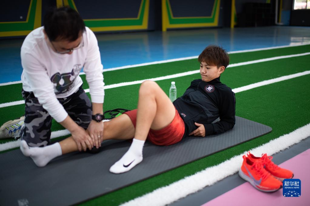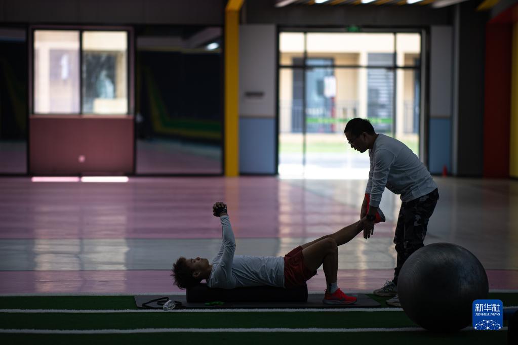 4月6日,王霜(左)在进行体能康复训练。