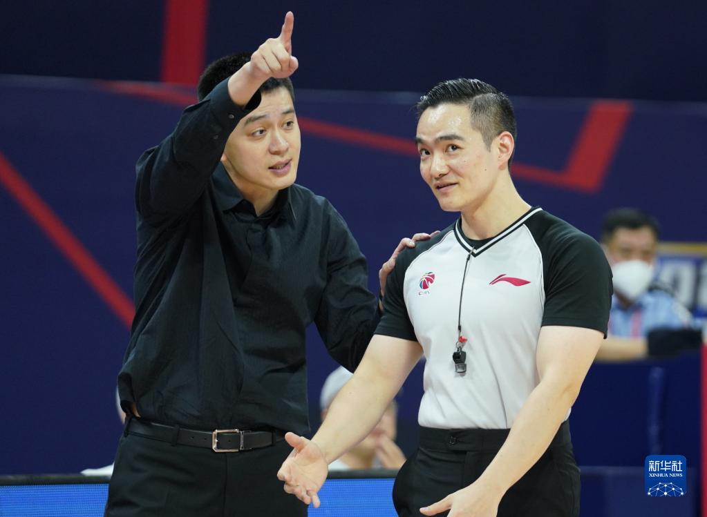 4月9日,辽宁本钢队教练杨鸣(左)与裁判沟通。