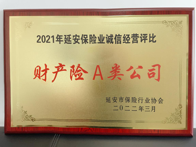 近日,延安市保险行业协会组织召开《2021年延安保险机构诚信经营评比》结果通报会议,太平财险延安市分公司被评为A类公司。