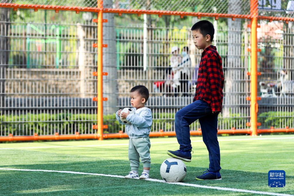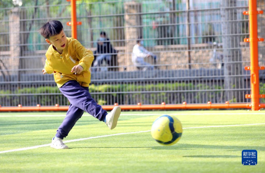 4月19日,小朋友在石家庄市裕华区希望绿洲公园足球场踢足球。该场地位于希望绿洲公园北侧,利用公园绿地新建五人制足球场,于4月初投入使用,吸引周边多个小区居民前来健身。新华社记者 骆学峰 摄
