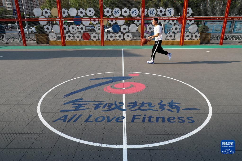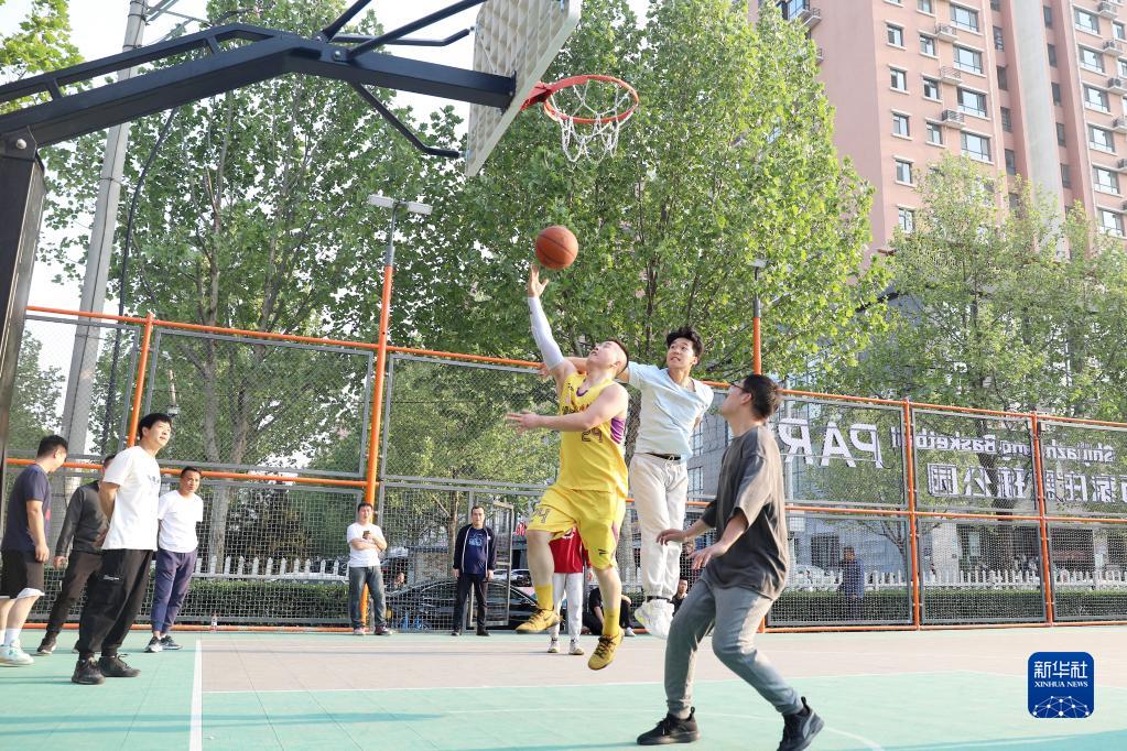 4月19日,市民在石家庄市长安区裕彤国际体育中心西广场篮球公园球场打篮球。该篮球公园球场利用裕彤国际体育中心停车场修建,占地600余平方米,于2022年4月初投入使用。新华社记者 骆学峰 摄