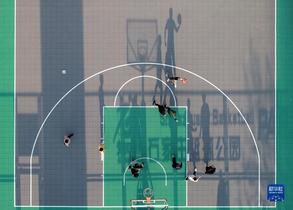 4月19日,市民在石家庄市长安区裕彤国际体育中心西广场篮球公园球场打篮球(无人机照片)。该篮球公园球场利用裕彤国际体育中心停车场修建,占地600余平方米,于2022年4月初投入使用。新华社记者 骆学峰 摄