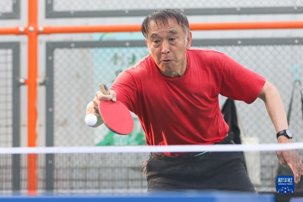 4月19日,市民在石家庄市裕华区丁香园公园球类运动场地打乒乓球。该运动场地为丁香园公园老旧篮球场改造而成,占地面积约1000平方米,建有篮球场地和乒乓球场地,可满足周边居民健身需求。新华社记者 骆学峰 摄