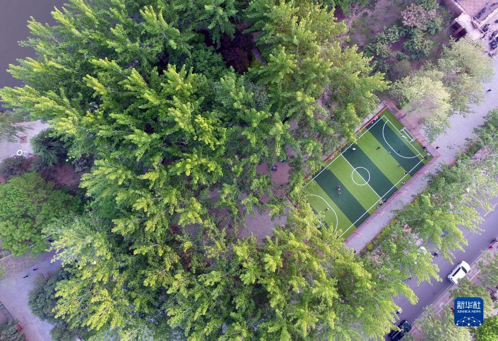 这是4月19日拍摄的石家庄市裕华区希望绿洲公园足球场(无人机照片)。该场地位于希望绿洲公园北侧,利用公园绿地新建五人制足球场,于4月初投入使用,吸引周边多个小区居民前来健身。新华社记者 骆学峰 摄