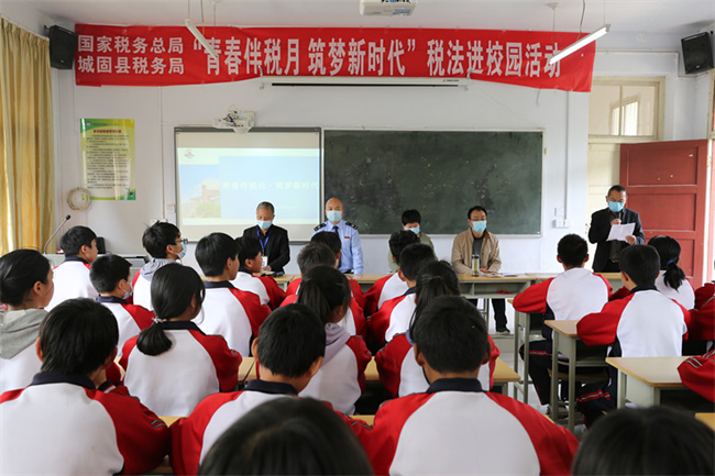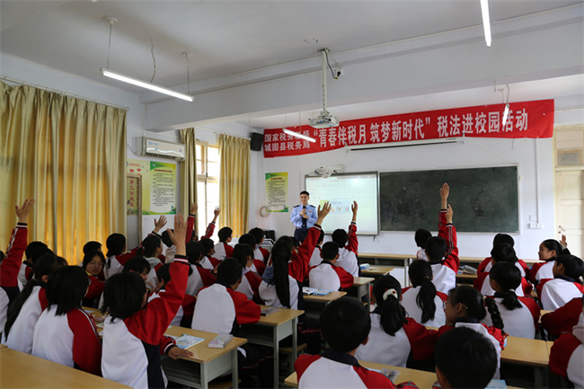 “我知道,我知道,税收可以用来保障防疫物资供应”“可以支援部队建设”“建学校、造航母”……在城固县五堵中学初一年级的课堂上,同学们正在热烈地讨论着税收的作用。4月22日,在全国第31个税收宣传月活动即将进入尾声之际,国家税务总局城固县税务局进一步巩固税收宣传月活动成果,联合五堵镇、五堵中心校等单位,共同走进五堵中学,为学生们带来了一场寓教于乐的税法宣传教育活动。