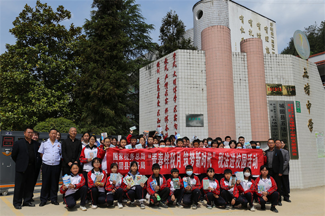 快乐的时光总是让人觉得短暂,活动结束后,在学校领导的带领下,税务干部们还一同参观了学校的宣传展板、操场、食堂、宿舍等校园场所,鼓励同学们好好学习、发奋图强,希望同学们继续学税法、懂税法,长大后做一名依法诚信纳税的好公民。 活动最后,大家共同在校门口合影留念。(衡洋)