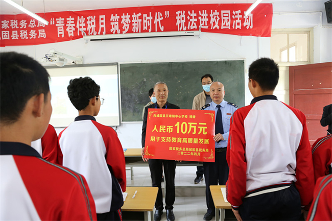 随后,城固县税务局围绕支持全县教育高质量发展工作要求,为五堵中心校捐赠人民币10万元,用于进一步优化更新教学设备,提升教育发展水平,以实际行动为教育均衡发展贡献一份力量,奉献一片真情!