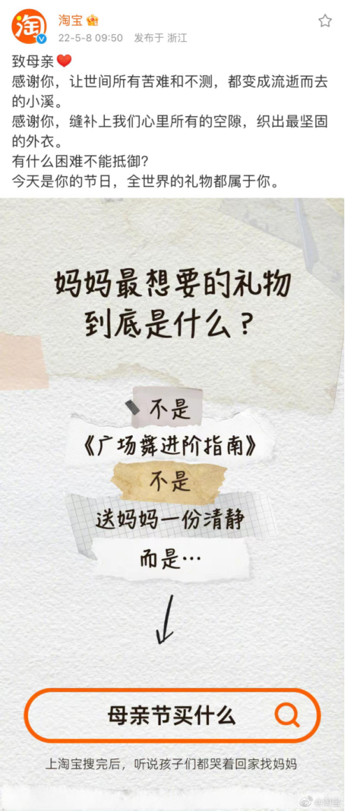 记者还发现,今天的淘宝天猫页面暗藏母亲节“彩蛋”。在淘宝APP搜索“母亲节买什么”,页面会弹出弹幕:“你的陪伴是母亲节最好的礼物”。有网友惊叹,淘宝竟然不号召大家“剁手”,也是走心了,“一句问候的分量,不比一份贵重的礼物轻。“