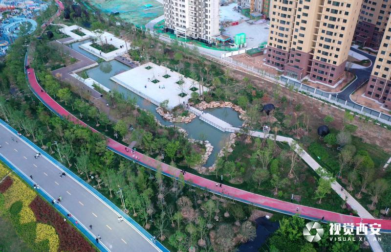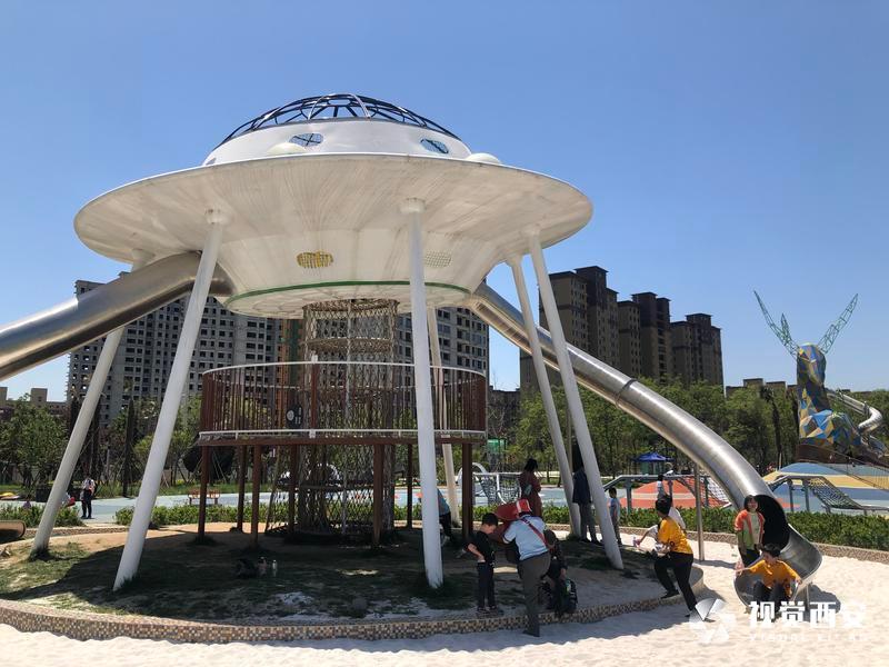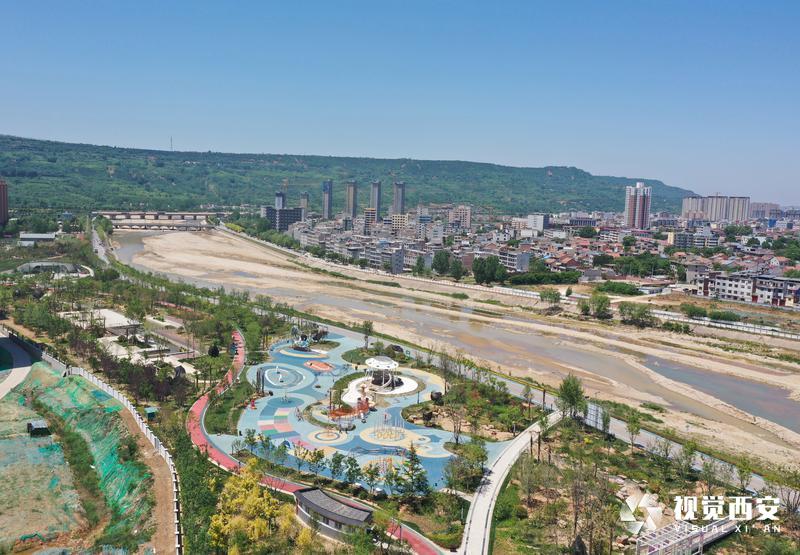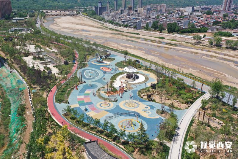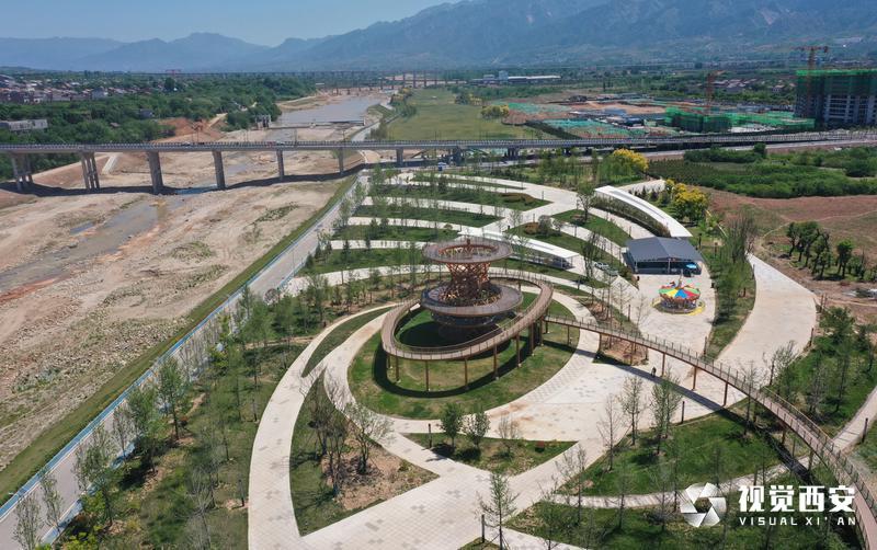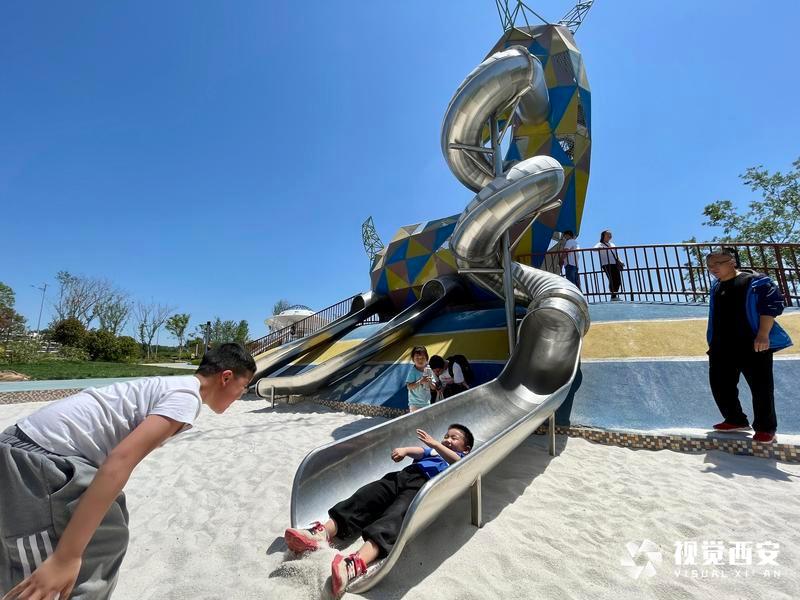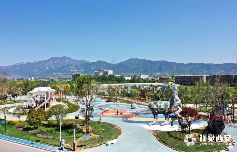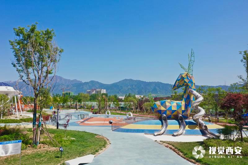 5月4日,碧空如洗,远处是连绵不绝的群山,旁边是蜿蜒流淌的河水,公园四周绿草成荫鲜花盛开,白鹿雕像为主题的滑滑梯矗立在广场正中央,刚刚建成的西安市蓝田县全域治水综合治理工程滋水公园受到众多游客青睐,这座以美玉文化、白鹿文化、滋水文化为主,依托自然水域打造的生态绿地景观,结合数字化、智能化的设计,充分展示了西安历史文化底蕴和生态环保理念。