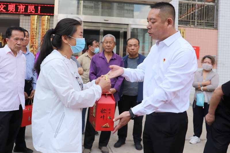活动中,环卫所负责人与东路社区负责人将85盒香气四溢的爱心粽送到他们手中,提前送上端午节的问候,并细致询问了他们的近期生活、身体、工作状况,关心了解他们所负责区域的实际需求,嘱咐他们注意保重身体,有困难及时向社区反映,让他们真切感受到党和政府的关爱,感受到社区大家庭的温暖。