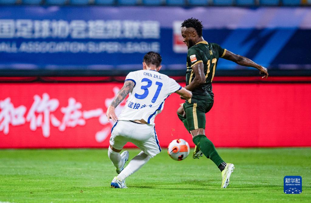 6月5日,北京国安队球员阿德本罗(右)与沧州雄狮队球员陈中流拼抢。新华社记者 孙非 摄