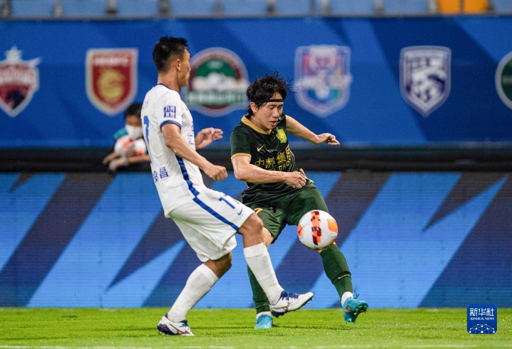 6月5日,北京国安队球员梁少文(左)在比赛中停球。新华社记者 孙非 摄