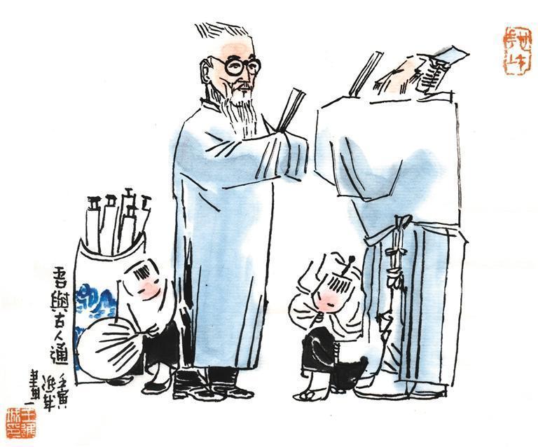 丰子恺从小喜好诗词,晚年仍经常写诗填词。有时,他还自撰诗词为题作画。比如,其古诗新画系列中的名作《今朝风日好,或恐有人来》,画中天朗气清、惠风和畅,男女主人在门前扫地、沏茶、备瓜果,静候亲友到来,一派人间温情。画题乃借用李白《宫中行乐词》“今朝风日好,宜入未央游”的前半句,再自撰了一句“或恐有人来”,二者连在一起,真可谓行云流水、天衣无缝,堪称绝对。