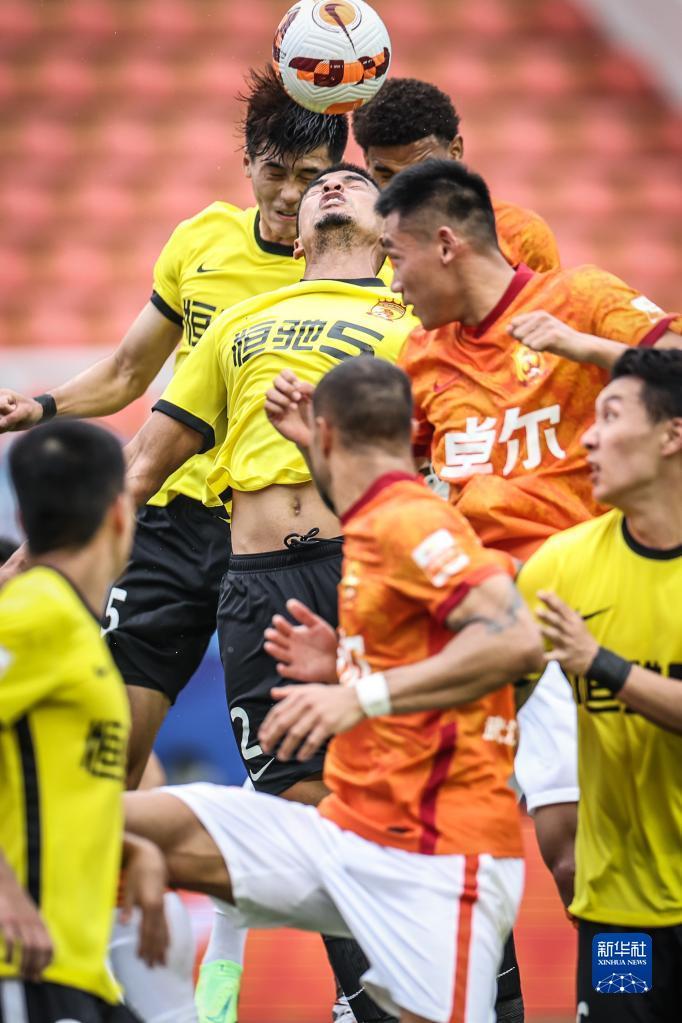 7月4日,广州队球员蒋光太(上中)在比赛中拼抢头球。新华社记者 潘昱龙 摄