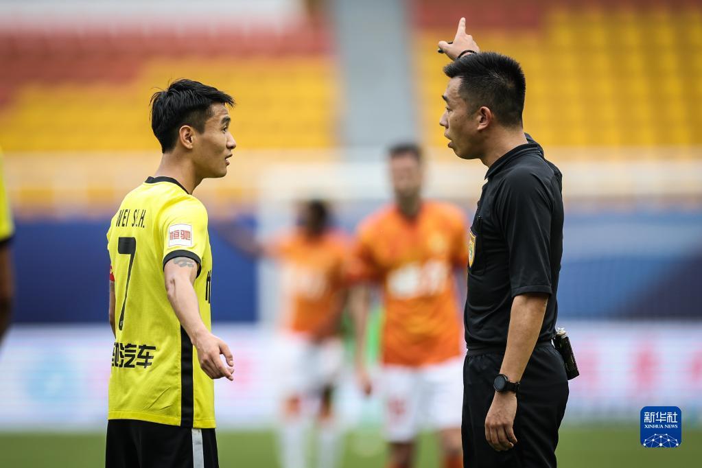 7月4日,广州队球员韦世豪(左)在比赛中与主裁判戴弋戈交流。新华社记者 潘昱龙 摄