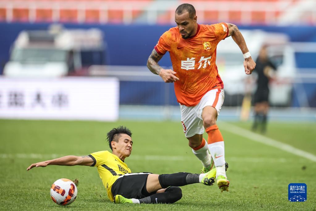 7月4日,武汉长江队球员卡耶维奇(右)在比赛中与广州队球员杨立瑜拼抢。新华社记者 潘昱龙 摄