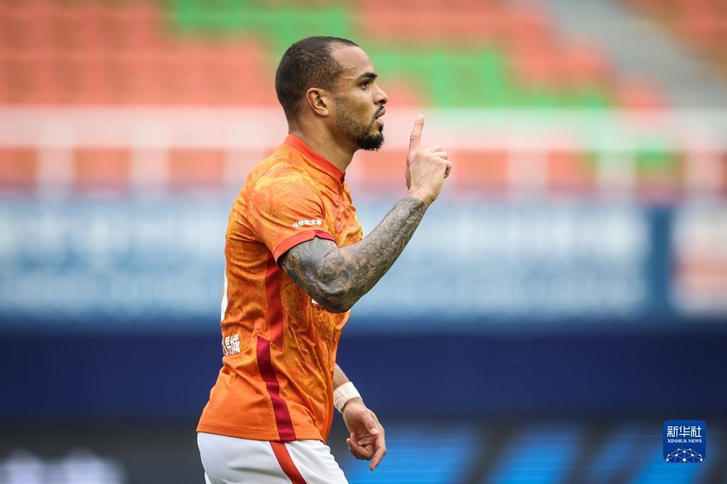 7月4日,武汉长江队球员福布斯进球后庆祝。新华社记者 潘昱龙 摄
