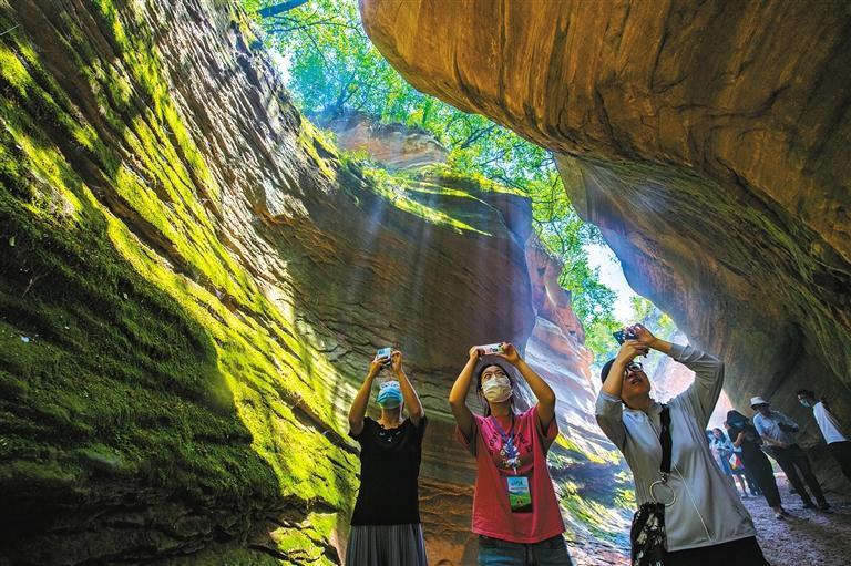 6月29日,游人在甘泉大峡谷桦树沟峡谷里游览。甘泉大峡谷历经亿万年流水侵蚀,逐步发育成典型的沟谷型丹霞地质奇观。峡谷外植被茂密、绿意盎然,峡谷内红岩峭立、绿苔茸茸。截至目前,景区累计接待游客逾百万人次,仅6月就接待游客万余人次,这里已成为陕西北线的重要旅游目的地。 记者 袁景智摄